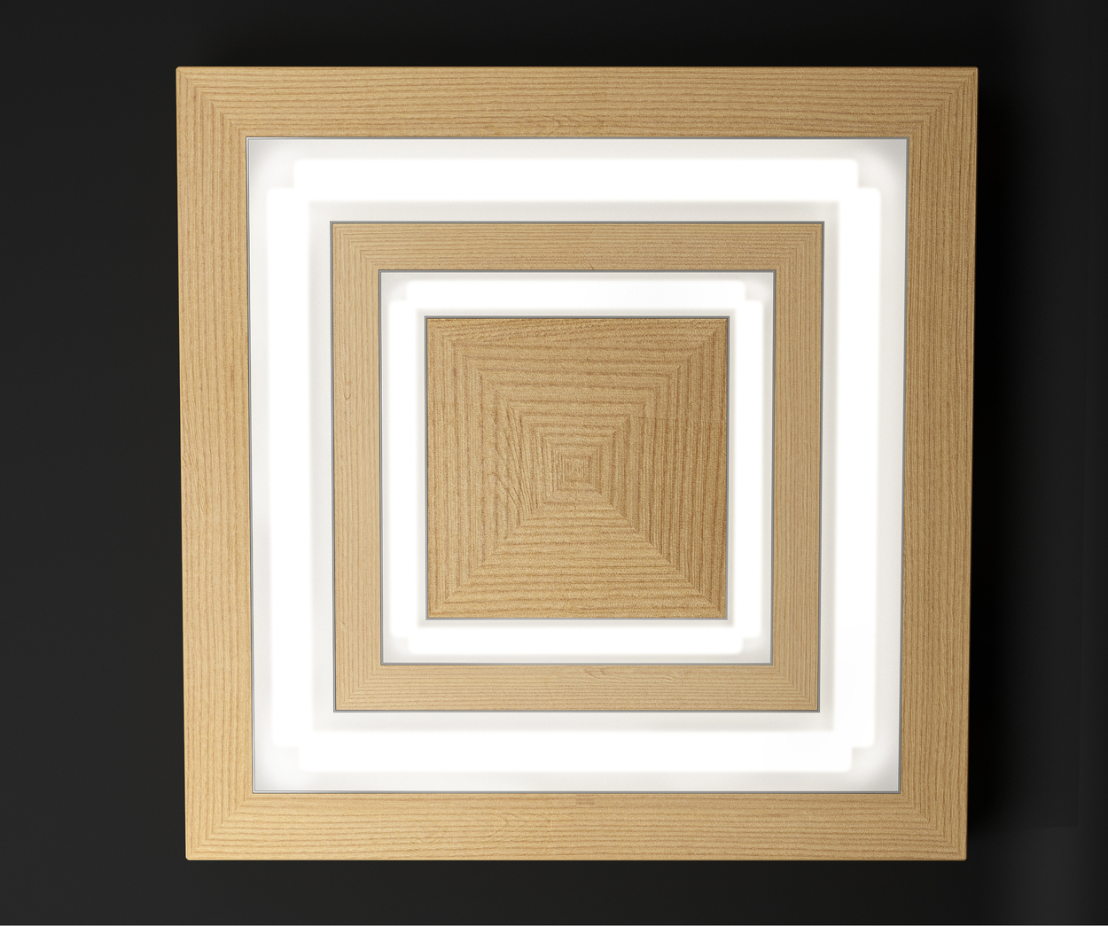 Geometryczny kształt lampy podkreślony został liniami światła, współgrającymi z rysunkiem słojów drewna.